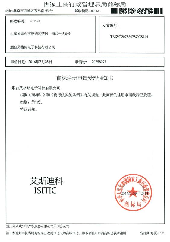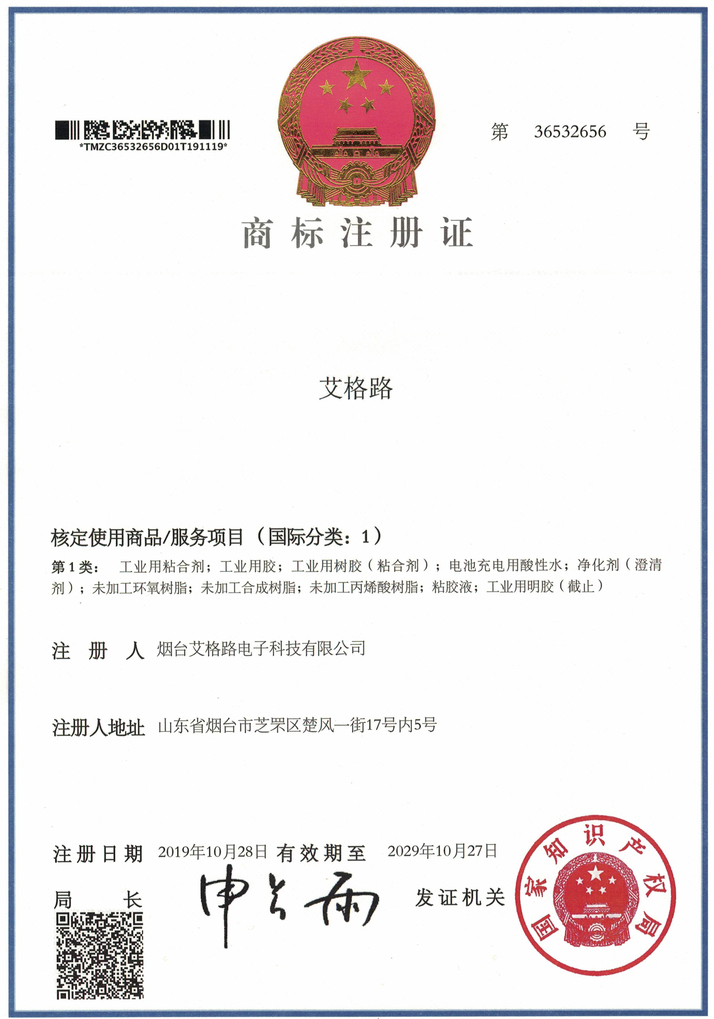 煙臺(tái)艾格路電子科技有限公司目前擁有四個(gè)注冊(cè)商標(biāo),分別是:艾格路?、艾斯迪科?,ISITIC?、tempbond?。艾格路解決方案和艾斯迪科品牌粘合劑期待著與您的溝通。